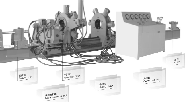 液压拆装架是一种六爪卡紧,双管冲扣式的钻具拆装设备固定钳和冲扣钳均采用可调式卡紧油缸,通过卡盘体及卡头来实现对钻具壳体的固定卡紧。冲扣钳的两侧板与卡盘体采用轴承座式联接,并通过端部法兰来实现端部限位。冲扣钳两端分别设有固定钳运行轨道与拉拔器运行轨道及快速旋扣器。快速旋扣器利用导柱定位及双缸夹紧,并利用四个摩擦轮来实现快速旋扣。因而,在拆装钻具时的运行移动方便,使卡紧,冲扣,旋扣,拉拔等系列工作一气呵成,一次性完成,大大减轻了劳动强度,提高了劳动效率。